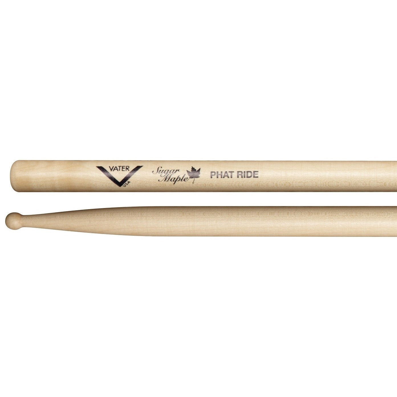 Vater's popular Phat Ride model is now offered in a Sugar Maple version. Same dimensions as the Hickory model, but made from Sugar Maple for a lighter weight and softer touch. Quick taper to a medium-sized round tip produces a clean sound on ride cymbals. A very versatile stick. Also available in a hickory version.