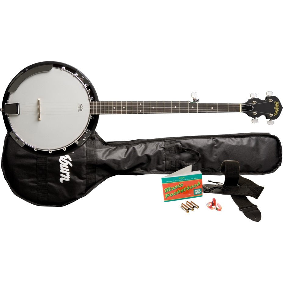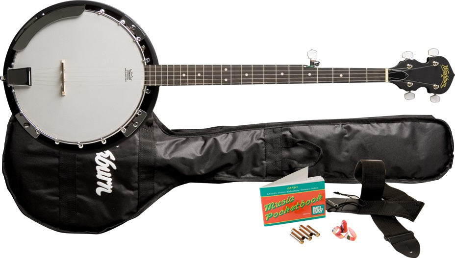 The B8-PACK includes a Washburn B8 Banjo, gig bag, pitch pipe, picks, instructional book, strap, and limited lifetime warranty.