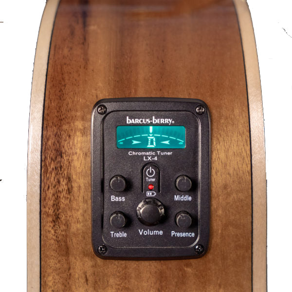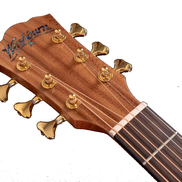 The flagship offering in the Bella Tono series is the SC56S Allure; pulling out all the stops and ticking off all the boxes. This model features a solid Spruce top, gorgeous Acacia back & sides and cutaway body design for easy access to the upper frets. The soundboard is adorned with stunning abalone for both the rosette and purfling and is bound in maple. The ebony fingerboard continues with the lush appointments; depicting a beach island scene of a palm tree and birds in flight which are inlaid in exquisite abalone and turquoise. The Washburn Studio body design makes for an incredibly comfortable playing experience while managing to maintain the tight lows, focused mids and clear highs commonly associated with larger body sizes. The solid Spruce top helps define sonic nuances throughout the entire register of the instrument and showcases Washburn’s Comfort Arm Rest. Its full 25.5″ scale length extends an undeniable familiarity to the player and the satin finished, modern “C” profile of the Mahogany neck is smooth and cozy feeling in the hands. For live performance or in the studio, it comes equipped with a Barcus Berry LX4 pickup system.