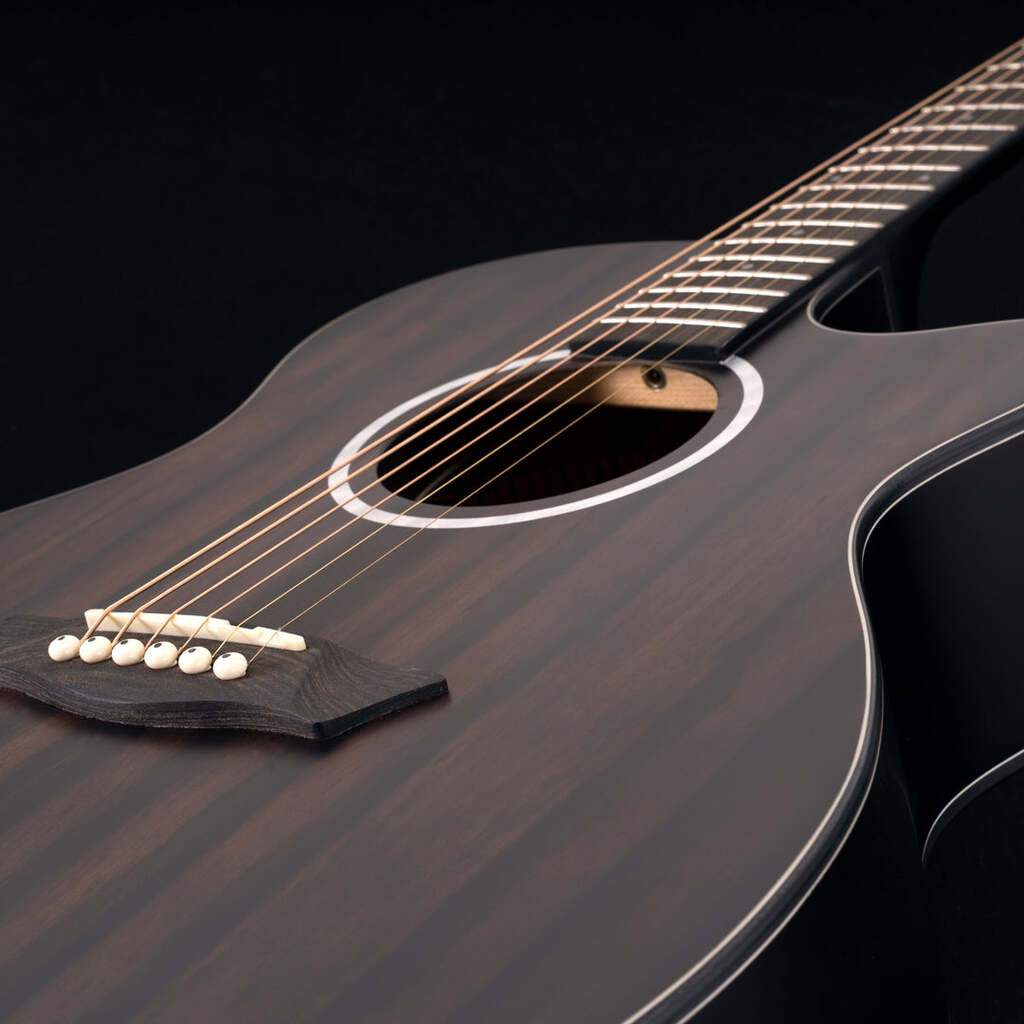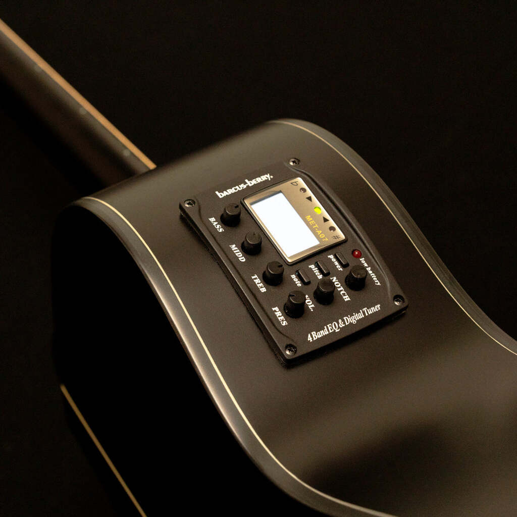 With one strum you will hear that rich low-end. The Deep Forest Ebony ACE has a warmth that you will not find on a typical spruce top guitar. When the wood blends of the Ebony ACE are coupled with the size, shaping, and bracing of this auditorium cutaway, you enjoy added articulation and an easy-to-achieve great guitar tone that some have described like having a natural compression. With the integrated Barcus Berry active electronics, the Deep Forest Ebony ACE is ready for the stage as well as any all-acoustic opportunity you get.