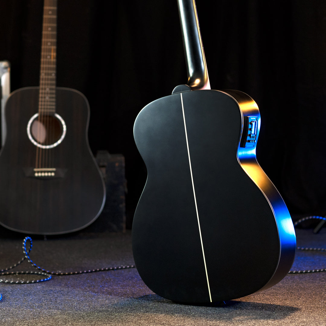 The vintage-style body on the Deep Forest Ebony FE is small and comfortable. The sonic combination of this slightly undersized body with these woods is really special. The wood blends are naturally full of deep, rich overtones that bring forward its low end. The smaller body and bracing assure that it is also articulate and balanced. Need to switch from acoustic to amplified? No problem — the Deep Forest Ebony FE is equipped with Barcus Berry active electronics, including integrated tuner