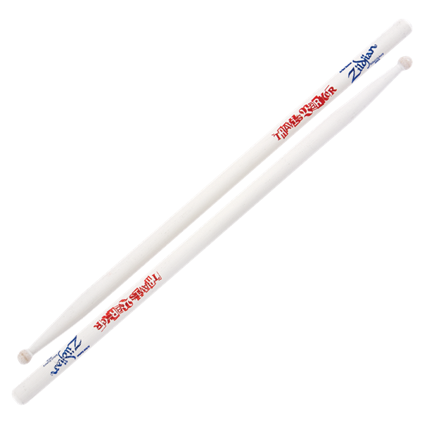 Designed by the super quick drummer for one of the world's most colorful bands. This dynamic stick features a two-color metallic logo on a highly visible White drumstick. The stick's round wood bead and beefy neck stand up to aggressive playing styles. Great for live performance. This stick has a great throw and balance.