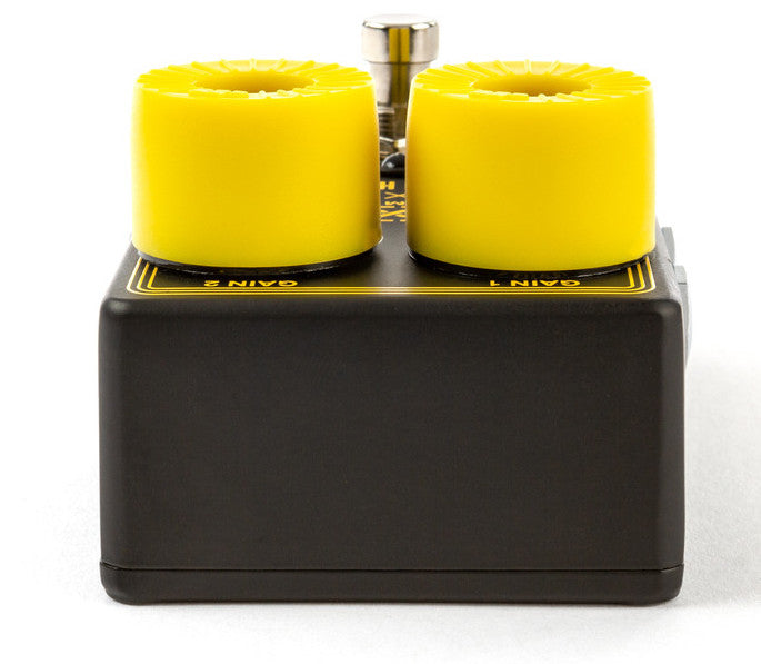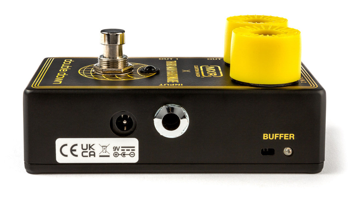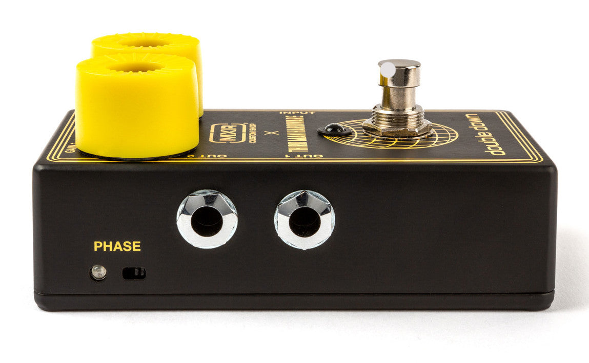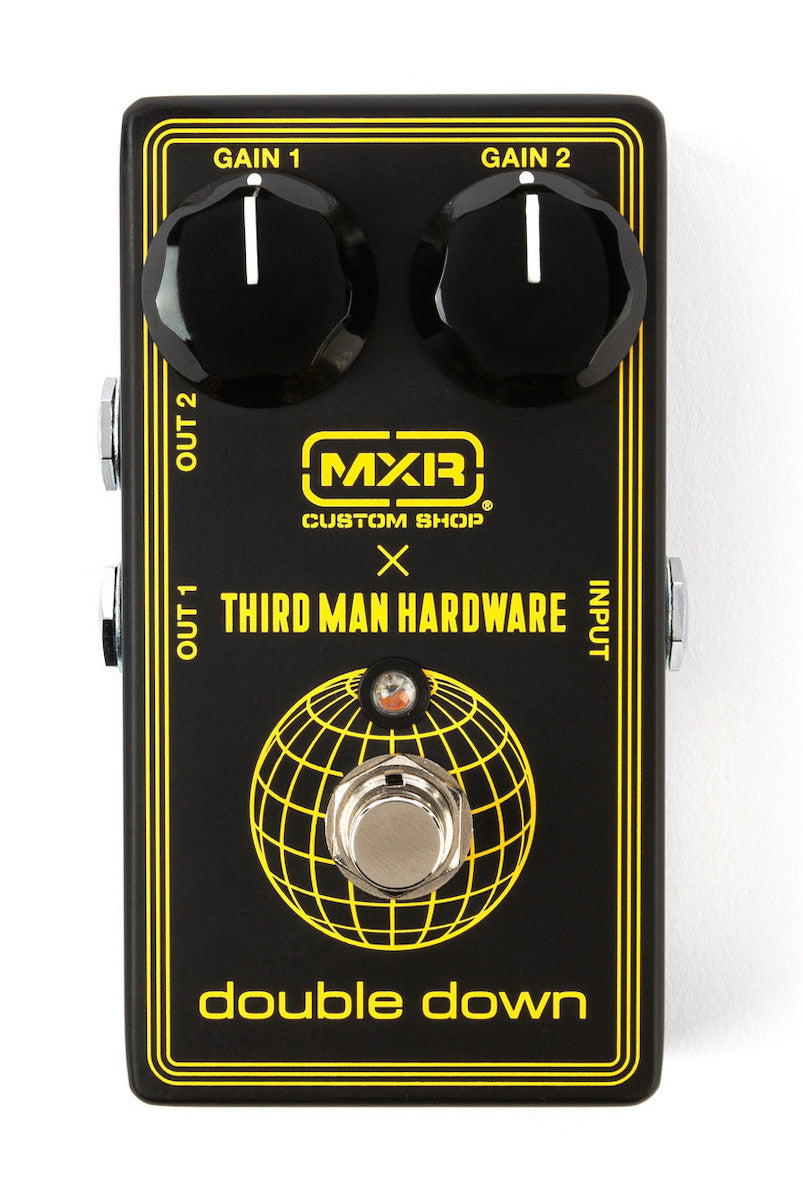 MXR and Third Man Hardware have teamed up to create the perfect booster for gigging guitar players. The Double Down Pedal combines two separate MXR Micro Amp circuits into a single box so that you can heat up two separate signal chains with just the right amount of classic Micro Amp bump. The Double Down Pedal’s single input jack splits your signal to two separate outputs, each with its own Gain control for up to +26dB of signal-boosting power. On the left side of the housing is a Phase switch that adds a pronounced stereophonic effect by inverting the phase of the second output signal. On the right side of the pedal is a Buffer switch so that you can choose between true bypass—for the purists—and buffered bypass switching to keep your sound intact when driving two signal chains. Plug into the Double Down Pedal from MXR and Third Man Hardware, and double boost your double stack.