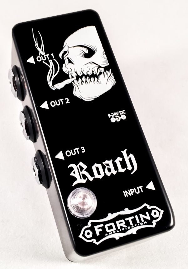 The ROACH is a mini sized 3-way splitter discrete Class-A buffered outputs. Due to its size, only powers via the DC inlet and has a wide acceptance, 9-24vdc. MOSFET input protects if the wrong orientation adaptor is connected, no more damage internally. LED is clear high-bright green. Proudly made in North America. Pedal size (W/D/H): 3.642?(92.51mm) x 1.516?(38.51mm) X 1.220?(30.99mm) DC Adapter (not included): 9-24VDC, Center Pin Negative (Regulated) Power supply only, no battery operation Current draw: @9VDC ~ 4mA Input ~1M / Output ~10K min. load Frequency response: 20hz to 20khz Max output: +9dBm(9VDC), +18dBm(24VDC)