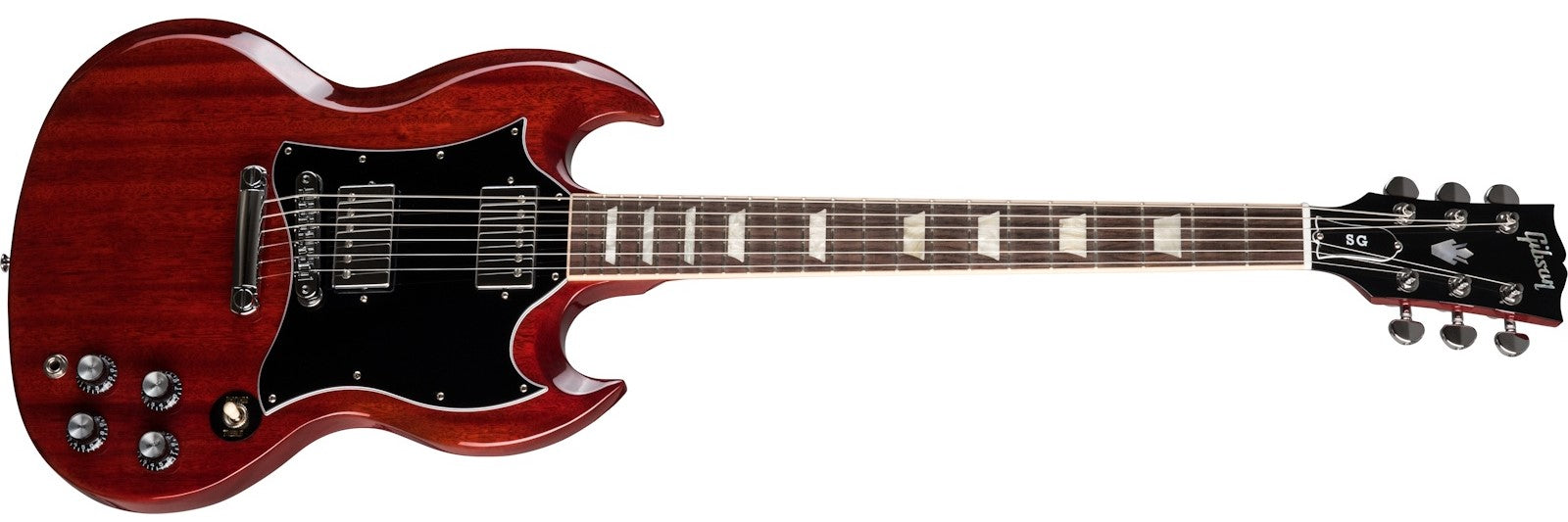 The Gibson SG Standard rocks the classic looks and features associated with the late 60's style SG models sought after by many. A rounded profile mahogany neck, bound rosewood fingerboard, long tenon 19th fret neck joint, and a solid mahogany body provide the backbone for singing sustain. The 490R and 490T Alnico II pickups provide the power to drive. A black, 5-ply, full-face pickguard set this SG Standard apart from others... a truly versatile classic.