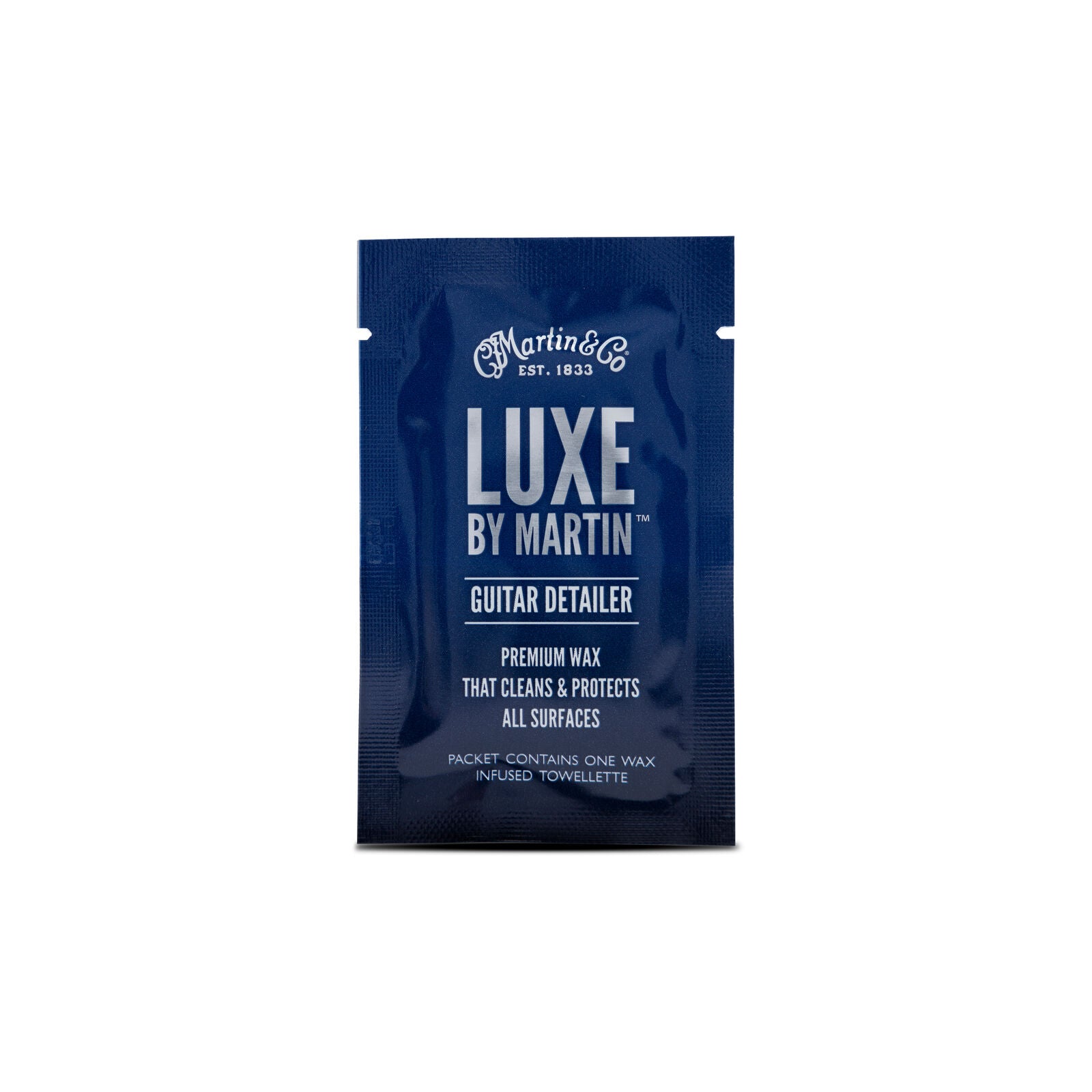 LUXE BY MARTIN® Guitar Detailer is a premium wax that cleans and protects all surfaces of guitars. Developed exclusively with Zymöl™. This ultimate natural cleaner and protectant comes in a quick, easy to use single use packet containing a wax infused towelette. Formulated with all natural ingredients this cleaner-wax combo is safe for all guitar surfaces. Bring home the product used and approved at Martin’s factory and care for your guitar with the very best.