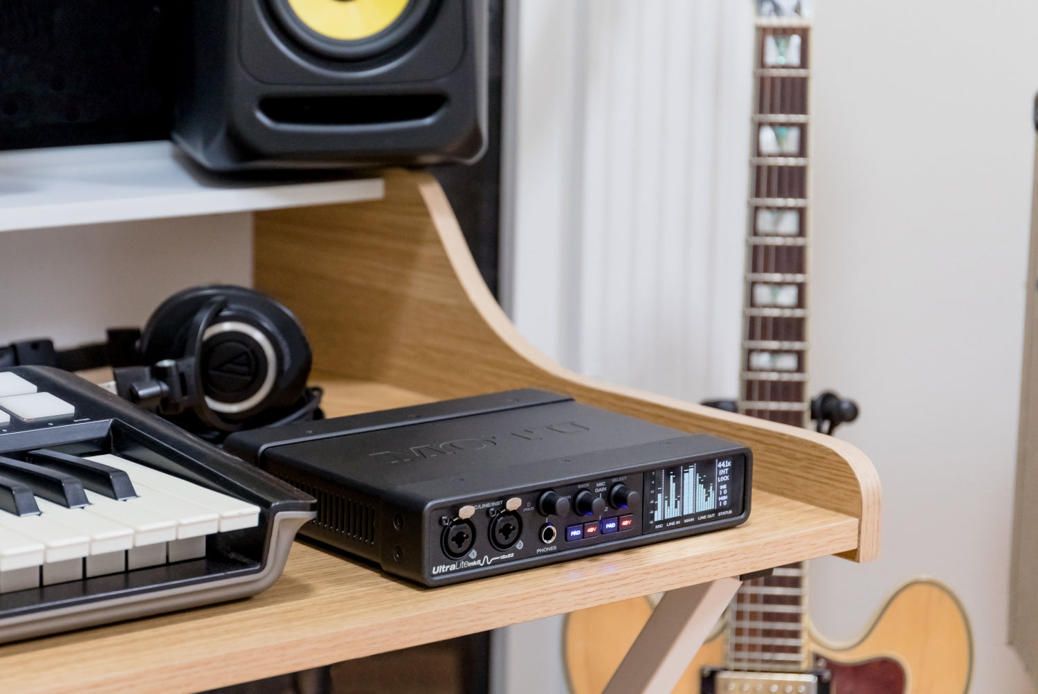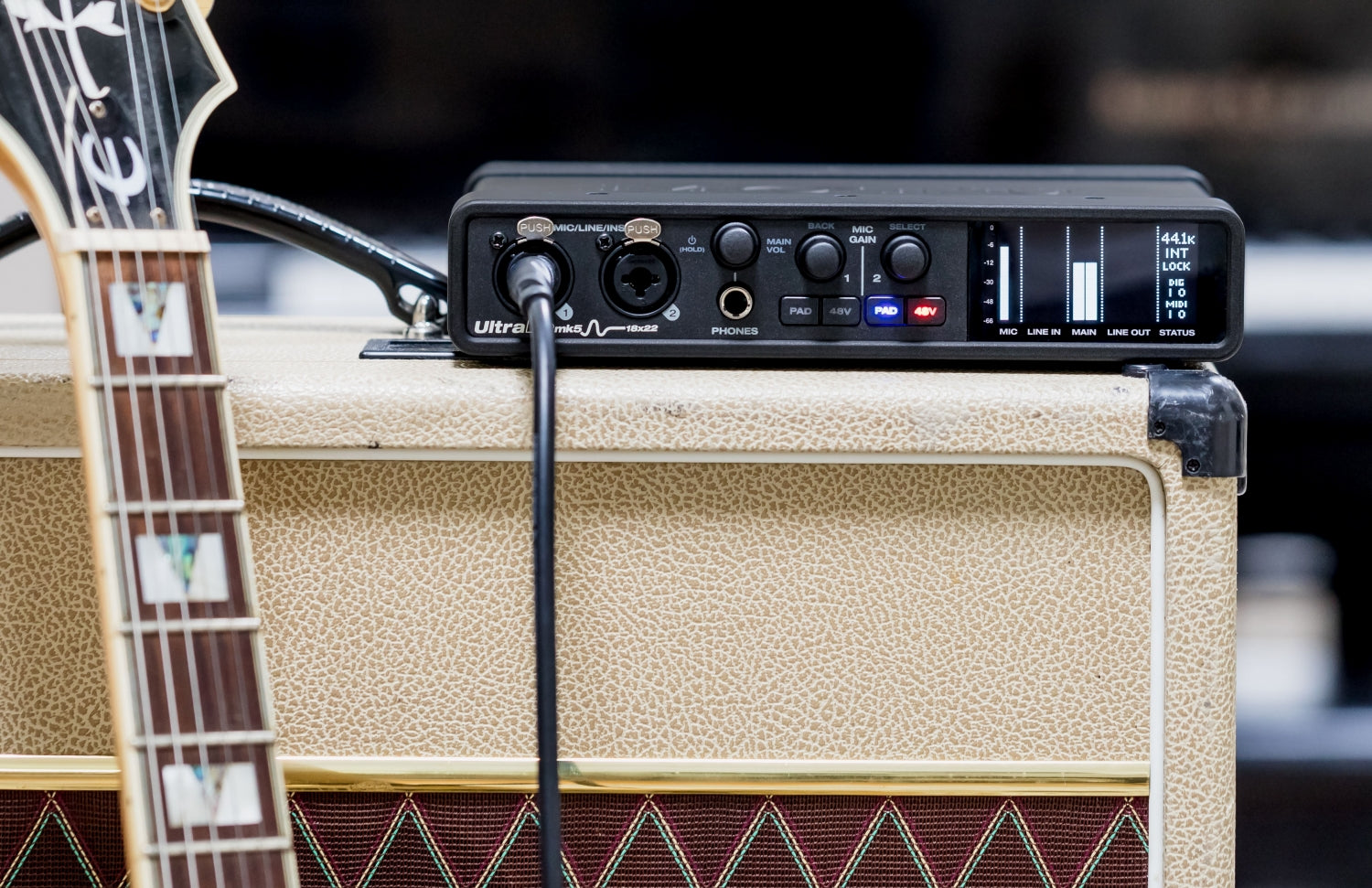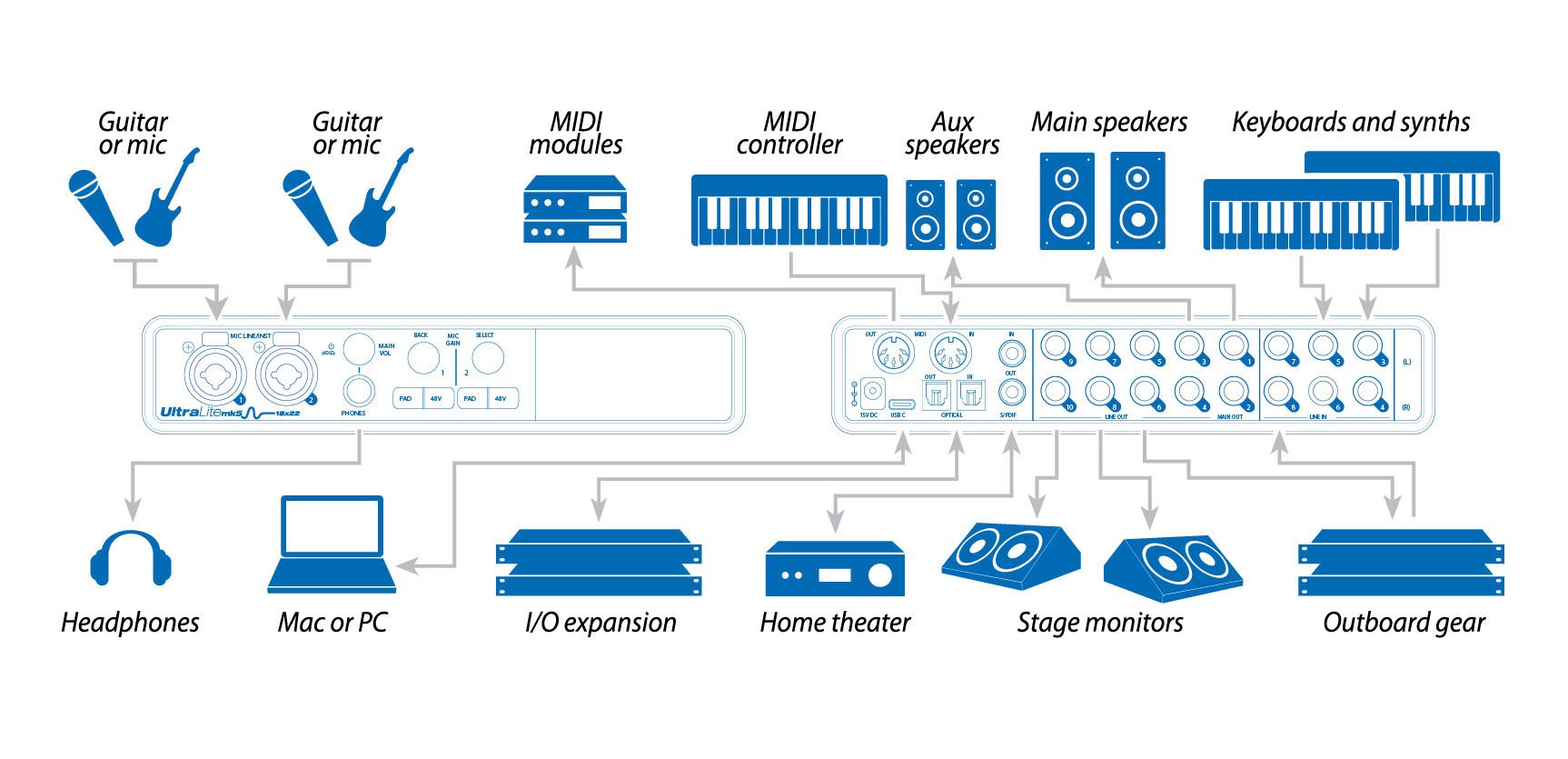 Connect all of your audio gear, including speakers, headphones, mics, guitars, synths, keyboards, drum machines, effects processors and even MIDI devices.