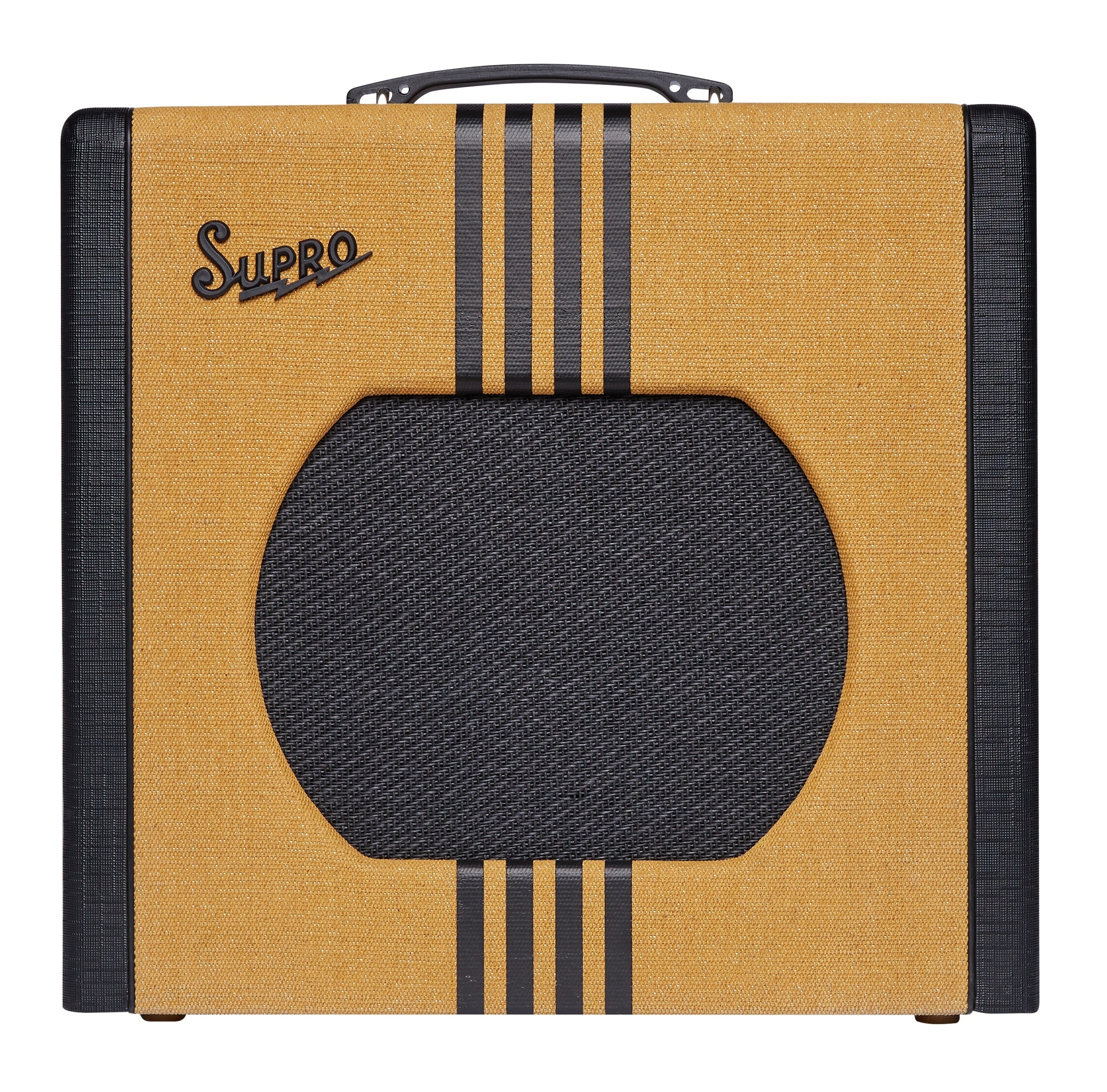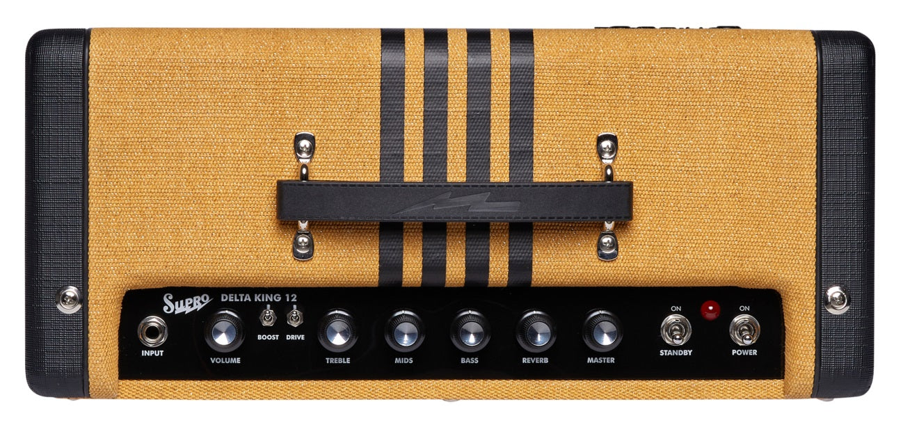 Hearkening back to the original Supro combo amplifiers, the Delta King 12 features a custom, poplar cabinet design, and two unforgettable colorways: custom tweed with black stripes, and black with cream stripes.