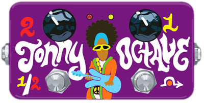 The Jonny Octave is an octave-up pedal designed to raise the apparent pitch of single notes on your guitar by one or two octaves. The controls are, from left to right, Octave 2 Volume and Octave 1 Volume. The two switches are, from left to right, Octave 1/Octave 2 selector switch and True Bypass switch.